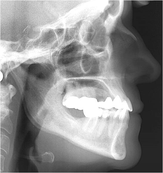 Jeder Mensch neigt dazu, sein Gesicht in der frontalen Ebene, achsengerecht d. h. im Lot, von Oben nach Unten, gerade zu stellen. So ist es typisch, dass Patienten mit einem Rückbiss das Kinn eher nach Vorne schieben und die Stirn eher nach hinten geneigt ist. Umgekehrt verhält sich der Patient mit Vorbiss (Progeniepatient) so, dass er den Kopf eher nach vorne unten neigt um wieder eine gerade Stellung des Gesichts zu erhalten. Diese unterschiedliche Neigung des Kopfes, hat einen erheblichen Einfluss auf die Atemwege! Der nach vorne geneigt Kopf verengt die Atemwege und der nach hinten geneigte Kopf öffnet die pharyngialen Atemwege. Durch die neue Kieferrelation, hat diese Patientin trotz Retrusion der Unterkiefer Front eine Verbesserung des respiratorischen Traktes mit Vergrößerung des Mesiopharynx erreicht.