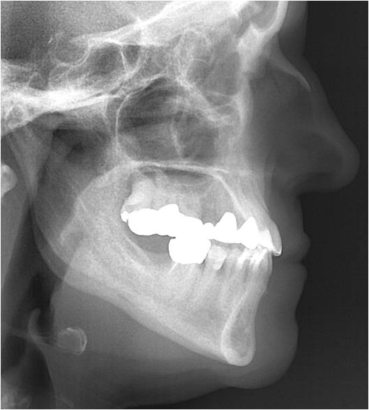 Im Fernröntgenseitenbild ist sichtbar, dass die Profilverbesserung der Patientin durch Retrusion der Unterkiefer Front erreicht wurde. Sehr interessant hierbei ist folgender Zusammenhang: